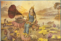 Whether you call it chitra vina or gottuvadyam, believe you me it is one of the instruments that you really must listen to before you die. The charming image is of Saraswati, the Hindu Goddess of learning, music and the arts, from the era of the gramophone and retrievable sound. From Ragas from South India (Folkways FW 8854, 1967)